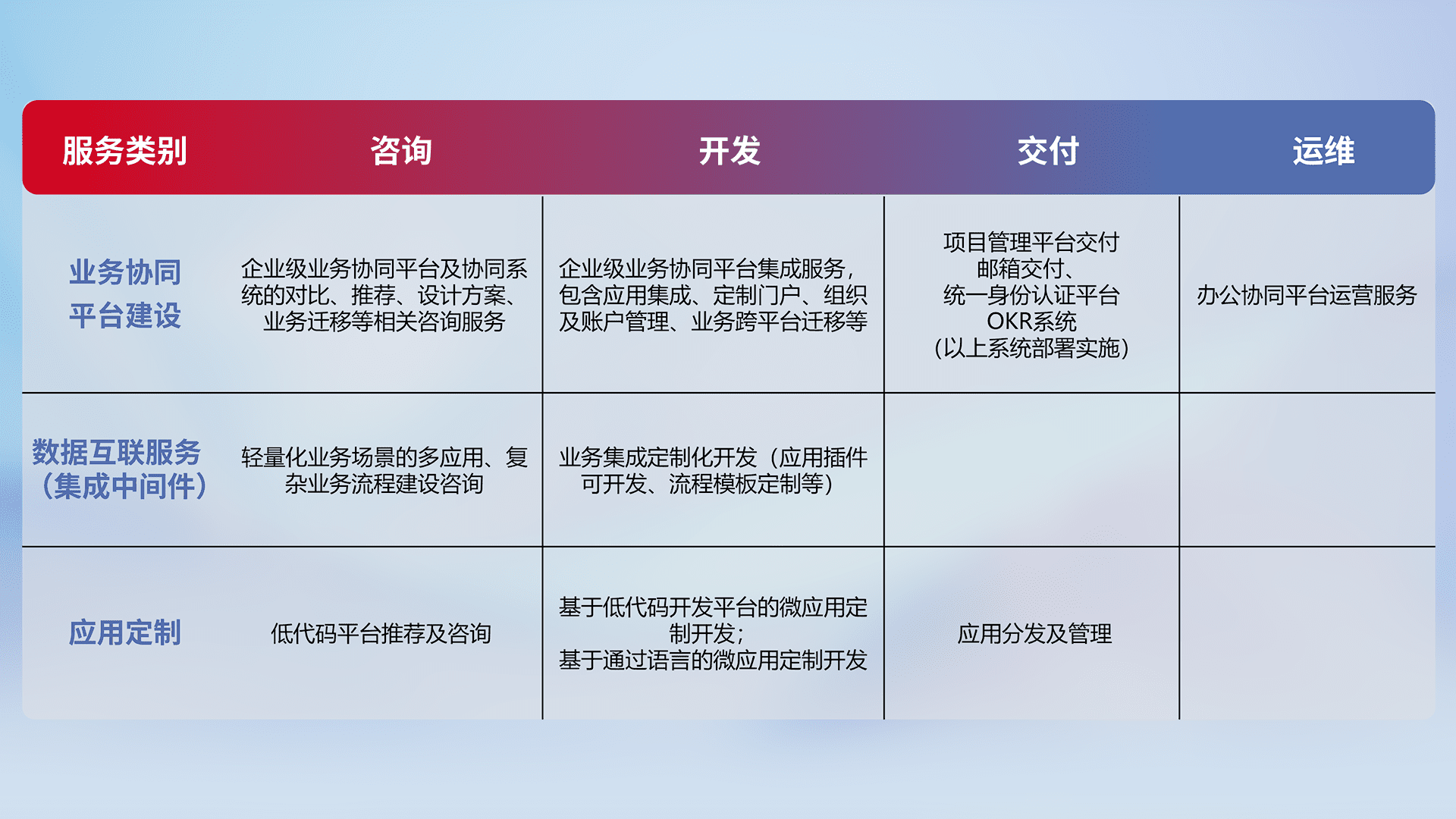 针对钉钉、、、企微、、、IDaas等平台级产品提供产品的规划、、、、方案、、、交付、、、定制化开发等服务,,,,实现如统一协同办公、、、智能客户服务、、混合会议管理、、智能数据查询、、等业务场景,,,实现数字化转型。。。。